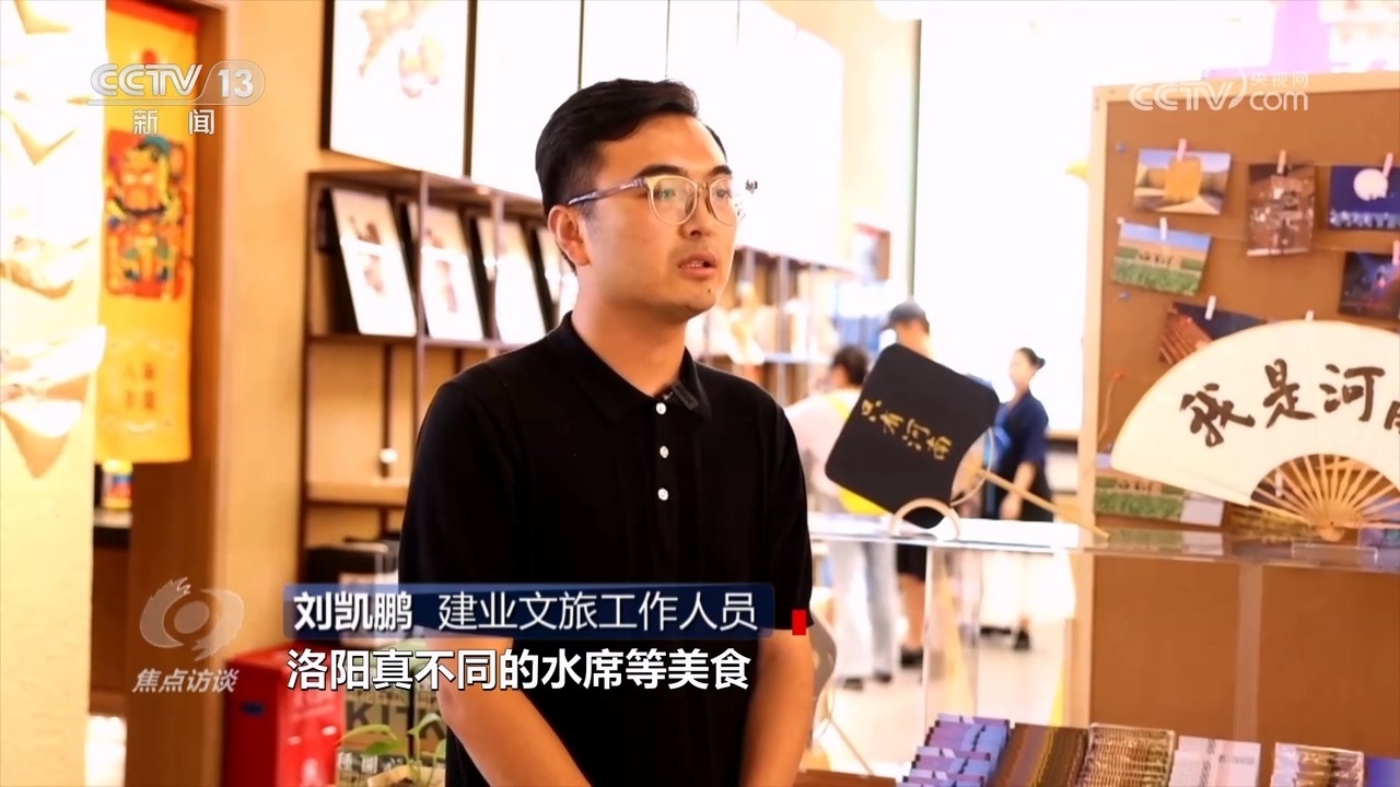 建業(yè)文旅工作人員劉凱鵬:“這個(gè)暑期的省外游客占比已經(jīng)超過六成,我們也深度挖掘了當(dāng)?shù)匚幕头沁z文化,游客可以通過拓印一張木板年畫、手做一副蒲扇,來感受非遺文化的記憶之美,同時(shí),各種各樣的河南特色小吃、洛陽真不同的水席等美食,讓游客除了戲劇以外,全方位沉浸在河南文化的熏陶當(dāng)中?!?/p>