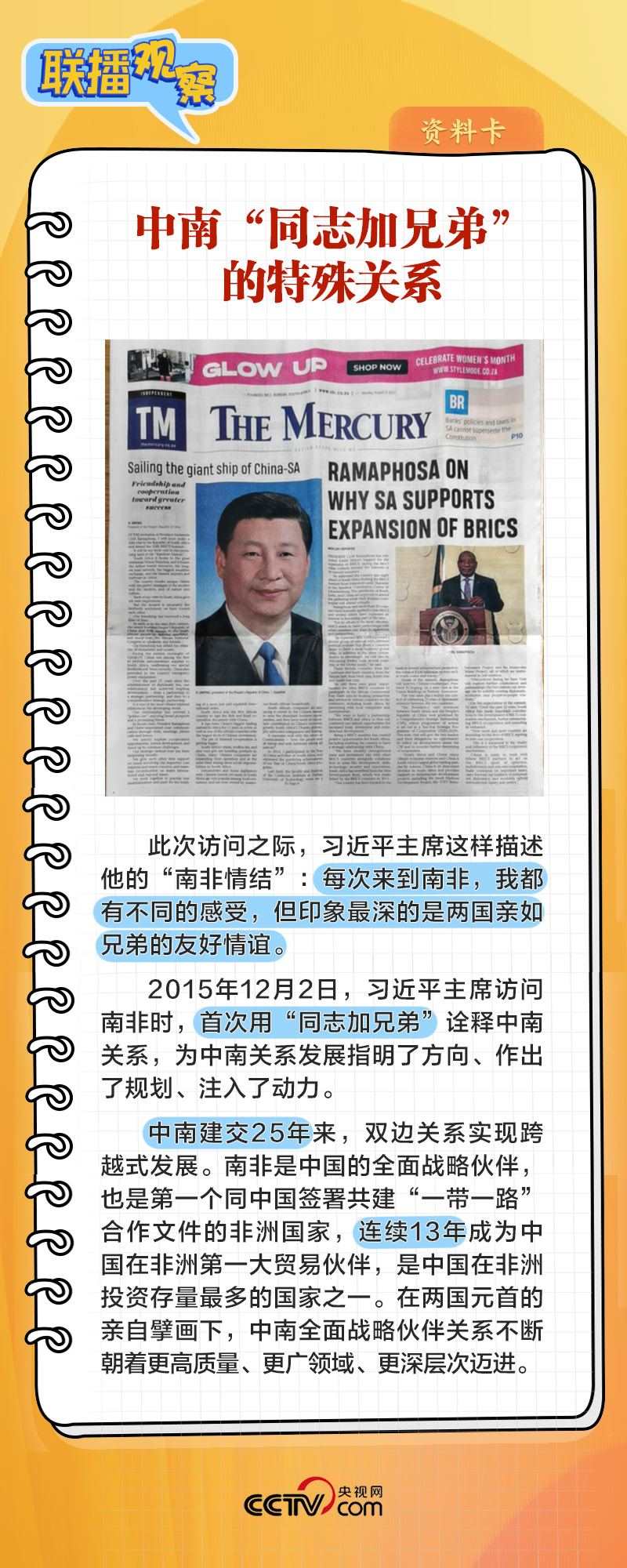 8月22日上午,在同南非總統(tǒng)拉馬福薩舉行會談時,習(xí)主席表示:“中南關(guān)系之所以好、中南友誼之所以深,關(guān)鍵在于兩國兩黨在各自發(fā)展道路上休戚與共,結(jié)下了同志加兄弟的深厚友誼?!?/p>