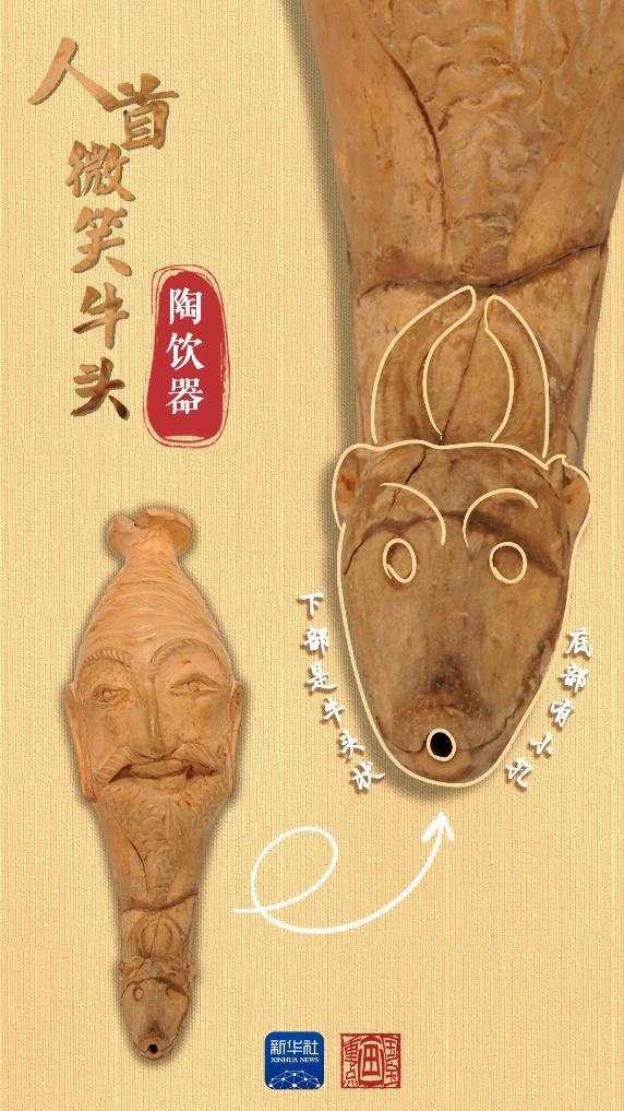 當(dāng)中國絲綢的美譽(yù)經(jīng)由古絲綢之路在西亞、歐洲等地傳揚(yáng)時,西方文明也穿過風(fēng)沙與長歌,在中國留下了印記。人首微笑牛頭陶飲器出土于和田地區(qū)約特干遺址,為唐代時期文物。飲器上部為人首形,下部是牛頭狀,底部帶小圓孔,上下兩部分內(nèi)腔相通。人首上唇胡須外展卷翹,面帶微笑。牛頭微微上翹,牛角豎立攏圓。這種飲器造型源自“來通”,即末端為動物形或人首形的角杯,是小亞細(xì)亞和地中海地區(qū)常見的飲酒器具,絲綢之路沿線國家都有類似文物出土。