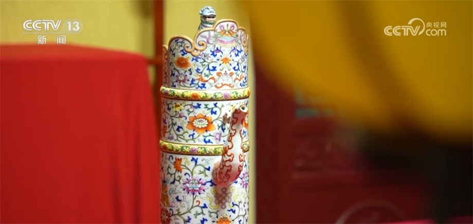 總臺記者 楊雪:沈陽故宮當(dāng)中的很多珍貴院藏文物都見證了多民族文化融合的過程,像我們眼前看到的這款清乾隆款粉彩多穆壺就是其中之一。多穆在藏語當(dāng)中是奶茶桶的意思,直到現(xiàn)在,像銅制、木制、皮質(zhì)的很多多穆壺仍然被蒙、藏等少數(shù)民族沿襲使用著。大家可以看到,這款多穆壺的蓋子上蹲坐著一只非常靈動的小獅子,有祈福和護(hù)佑主人的意思。這件多穆壺是國家一級文物,距今已經(jīng)有200多年的歷史了。