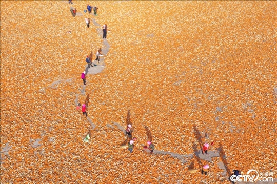 甘肅省張掖市,玉米種子喜獲豐收,晾曬場上一片金黃。