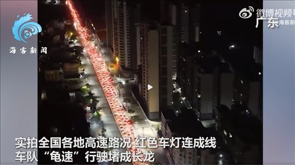 據(jù)海客新聞官方微博,10月4日,中秋國慶假期進入第6天,多地陸續(xù)迎來返程高峰。實拍全國各地高速路況,紅色車燈連成線,車隊“龜速”行駛堵成長龍。有網(wǎng)友曬出高速路況畫面表示“特意提前三天回去,沒想到又堵路上了?!?、“帶回的特產(chǎn)都要在路上吃完了”。