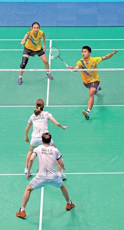 10月4日,杭州亞運(yùn)會(huì)羽毛球混合雙打1/8決賽,馬來西亞體育代表團(tuán)組合對陣泰國體育代表團(tuán)組合。圖為雙方運(yùn)動(dòng)員在比賽中。本報(bào)記者 伊霄攝