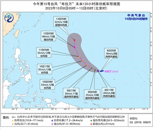 另外,今年第15號(hào)臺(tái)風(fēng)“布拉萬(wàn)”(Bolaven)于昨天(10月7日)下午生成,今天早晨5點(diǎn)鐘位于關(guān)島塞班東南方向約990公里的西北太平洋洋面上,就是北緯9.9度、東經(jīng)153.0度,中心附近最大風(fēng)力有8級(jí)(18米/秒),中心最低氣壓為998百帕,七級(jí)風(fēng)圈半徑150-200公里。
