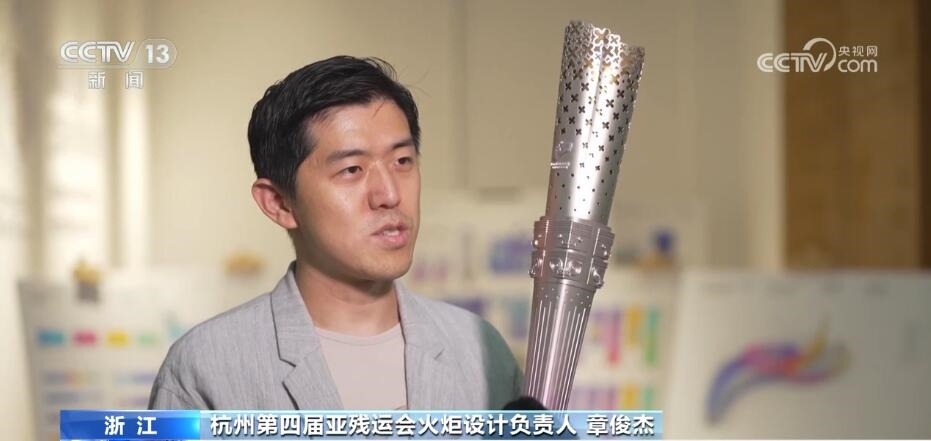 杭州第四屆亞殘運會火炬設(shè)計負(fù)責(zé)人 章俊杰:玉琮是實證中華五千年(文明史)的良渚(遺址)文明當(dāng)中的一個重要禮器,我們把玉琮作為核心意象,外方內(nèi)圓,我們在舉起火炬的時候,所有人的視覺焦點玉琮它承上啟下,分別代表了不同的寓意。承上,我們用點點的星光匯聚成桂花桂冠,可以看到星光越來越稠密,這是我們希望體現(xiàn)整個火炬設(shè)計的積極向上的那種力量感;玉琮往下,在這個地方設(shè)計有幾十條的科技線,它就好像是綿延著人類的歷史和城市科技的脈絡(luò)。