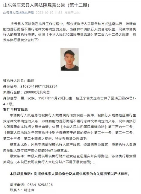 ·前國腳戴琳欠款28萬元,有能力而拒不履行被法院公開懸賞。