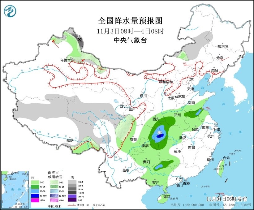 11月3日08時至4日08時,內蒙古東部、新疆北部、西藏北部和東部、青海中南部、川西高原北部等地部分地區(qū)有小到中雪,其中,新疆阿勒泰地區(qū)等地部分地區(qū)有大到暴雪(10~12毫米);陜西南部、四川東部、重慶中東部、湖北西部、河南西部、安徽北部、江蘇北部、廣西北部等地部分地區(qū)有中到大雨,其中,湖北西部、重慶東北部等地部局地有暴雨(50~60毫米)。內蒙古中西部、吉林中部、遼東半島、新疆北部等地部分地區(qū)有5~7級風,其中,新疆北部和東部部分地區(qū)有7~8級風,陣風9級(見圖3)。