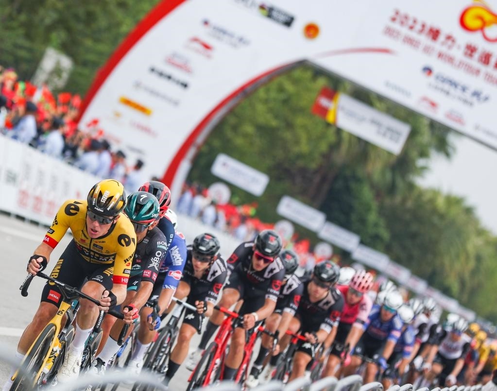 10月13日,參賽選手在2023年環(huán)廣西公路自行車(chē)世界巡回賽比賽中騎行。新華社記者 胡星宇 攝