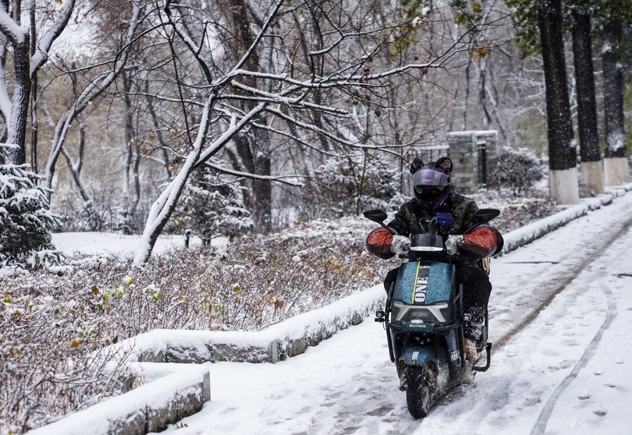 11月6日,在長(zhǎng)春市街頭,一名外賣員在雪中騎行。新華社記者 許暢 攝