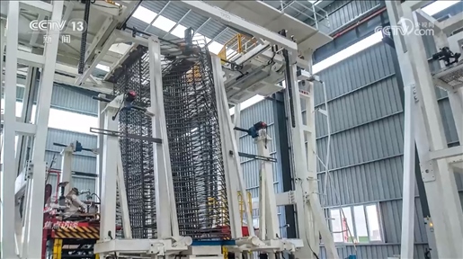 王輝:“通過手機(jī)掃描能夠數(shù)字化顯示鋼筋所有的生產(chǎn)信息,鋼筋智能生產(chǎn)的設(shè)備把原材料鋼筋做成單元件,通過這個設(shè)備的組裝形成了鋼筋片體。像這樣的片體5號塔要用3萬個,大概分成了3200組,每一組鋼筋用的部位都不一樣,為了精準(zhǔn)識別它用在哪里,每一組要給它一個識別信息,做一個二維碼,通過手機(jī)掃描就可以知道它要用在哪個地方?!?/p>