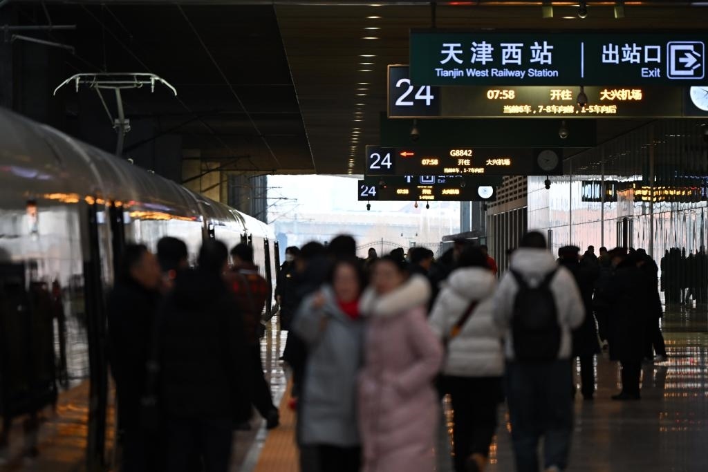 12月18日,G8842次列車停靠在天津西站站臺(tái)。新華社記者李然攝