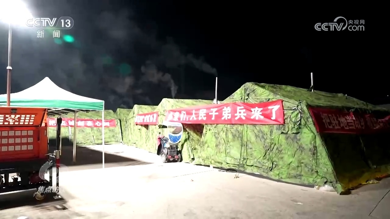 凌晨4時(shí),室外的溫度達(dá)到了零下13℃左右,安置點(diǎn)的每一頂帳篷里面都有一個(gè)取暖爐,取暖爐可以保證室內(nèi)的溫度,保證受災(zāi)群眾基本取暖需求。水果、飲料、榨菜、泡面這些基本應(yīng)急物資都有提供,還有一臺(tái)炊事車(chē),部隊(duì)的炊事車(chē)可以提供熱食,像做米飯、饅頭,包括一些炒菜、湯都可以實(shí)現(xiàn),可以滿(mǎn)足受災(zāi)群眾的一日三餐,滿(mǎn)足他們的基本用餐需求。