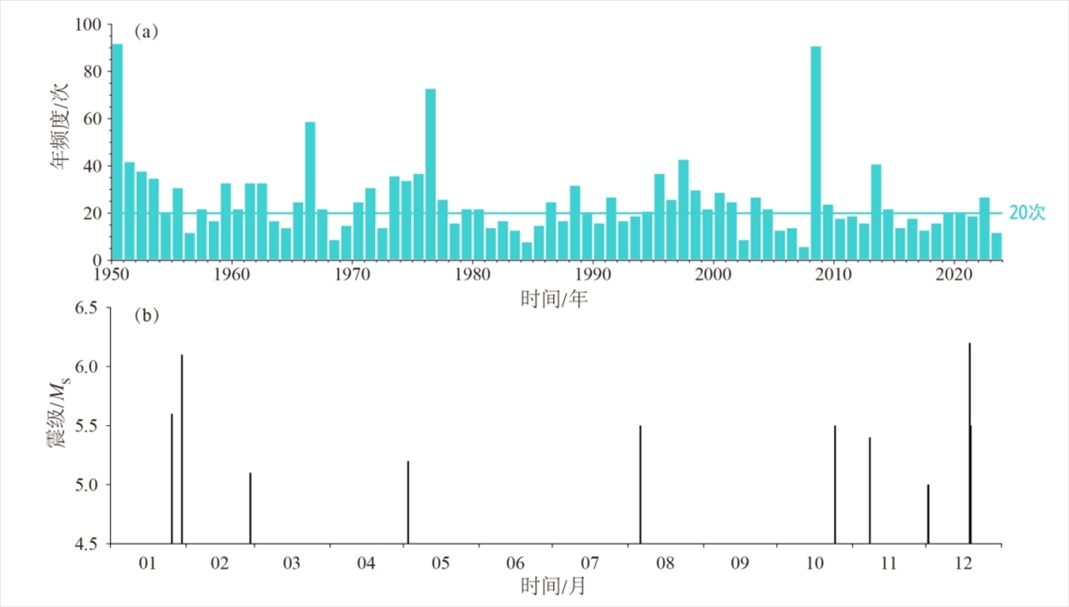 2023年以來大陸地區(qū)發(fā)生5級以上地震11次,最大為12月18日甘肅積石山6.2級地震,活動水平較2022年(27次,最大為2022年1月8日青海門源6.9級地震)和歷史平均水平(20次)明顯偏弱(圖a)。2023年5級以上地震時(shí)間分布不均勻,1月至2月發(fā)生3次,3月至9月僅發(fā)生2次,10月至12月增至6次,出現(xiàn)5級以上地震由弱轉(zhuǎn)強(qiáng)的活動特征(圖b)。