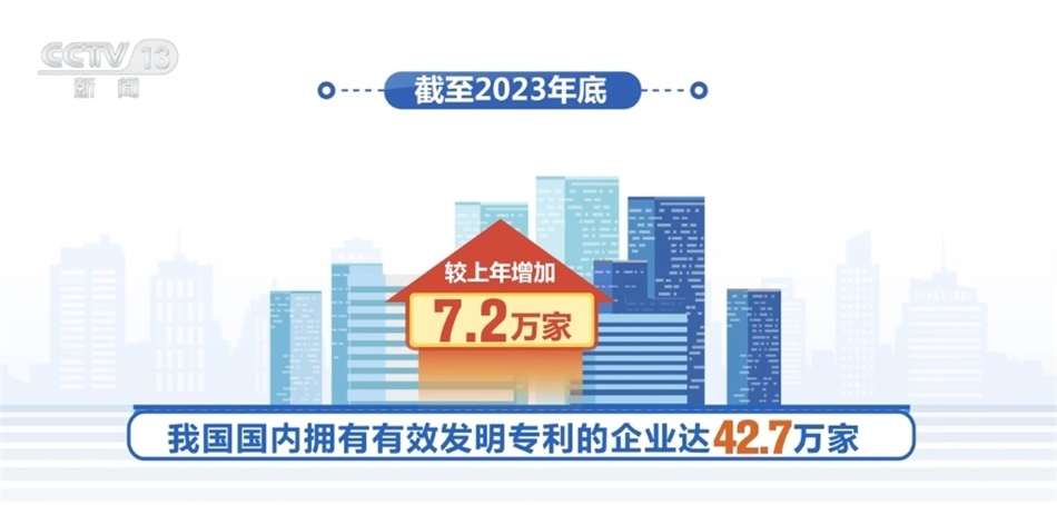 截至2023年年底,我國國內擁有有效發(fā)明專利的企業(yè)達42.7萬家,較上年增加7.2萬家。國內企業(yè)擁有有效發(fā)明專利290.9萬件,占比增至71.2%,首次超過七成,創(chuàng)新主體地位進一步凸顯。