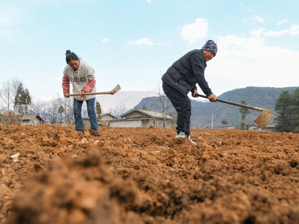 2月2日,巴木玉布木(左)和丈夫巫其石且在翻耕承包的土地,準(zhǔn)備來年種植葡萄。新華社記者 王曦 攝
