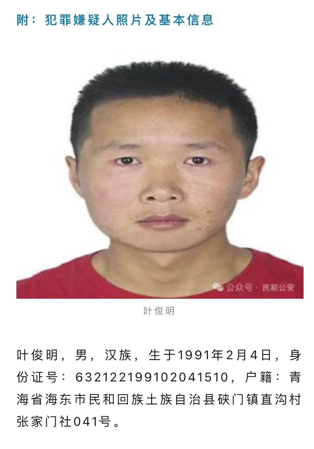 ·青海一重大刑案嫌疑人在逃!警方懸賞懸賞2萬緝兇。