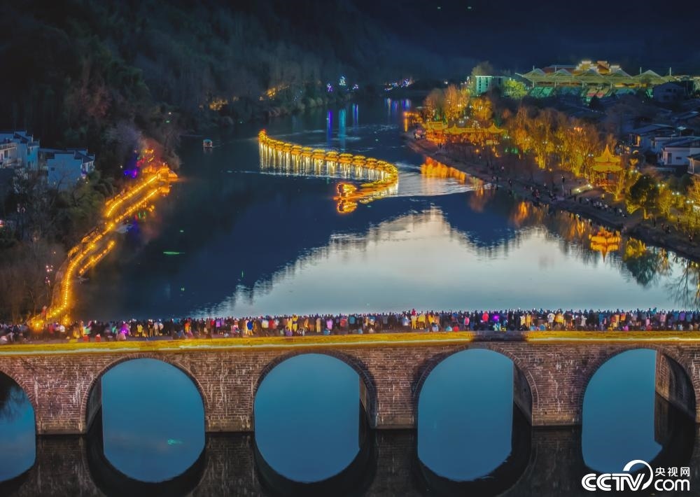 2024年2月12日,安徽黃山齊云山景區(qū),一條由幾十艘竹筏組成百米“金色巨龍”在橫江江面上游弋而過,構(gòu)成一幅震撼的金龍巡游畫卷。