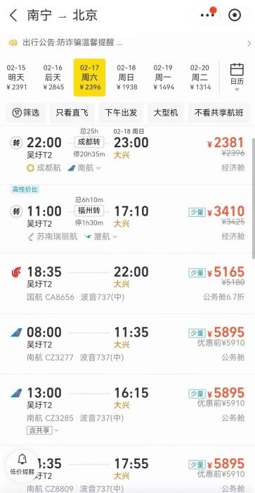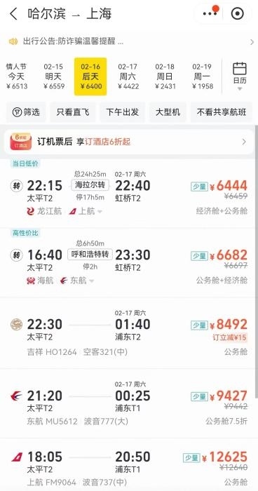 中新網(wǎng)2月16日電(中新財經(jīng)記者 謝藝觀)“火車票沒搶到,機票也沒經(jīng)濟艙的了”“回滬機票價格漲了3倍”“回京只剩高價公務艙”……