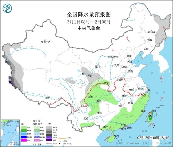 央視網(wǎng)消息:中央氣象臺(tái)網(wǎng)站2月29日消息,過(guò)去一天,全國(guó)雨雪逐漸發(fā)展增強(qiáng),北方大部以降雪為主,集中在西北地區(qū)東部、內(nèi)蒙古、山西、山東和東北三省等地;南方地區(qū)雨水范圍明顯擴(kuò)大,江蘇、上海、浙江、安徽南部、江西中北部、湖南中南部、廣西北部等地部分地區(qū)出現(xiàn)中到大雨,今天凌晨起,蘇皖北部出現(xiàn)雨轉(zhuǎn)雪,江蘇連云港、宿遷、徐州等地雪花紛飛,并伴隨低溫和大風(fēng)天氣,體感十分寒冷。