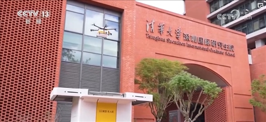 在深圳的一所大學(xué),一架無人機(jī)降落在外賣柜上方,通過精準(zhǔn)定位系統(tǒng)將外賣投入柜中。