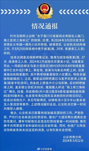 ·天津警方通報(bào)網(wǎng)傳“女子家門口發(fā)現(xiàn)三角標(biāo)記”。