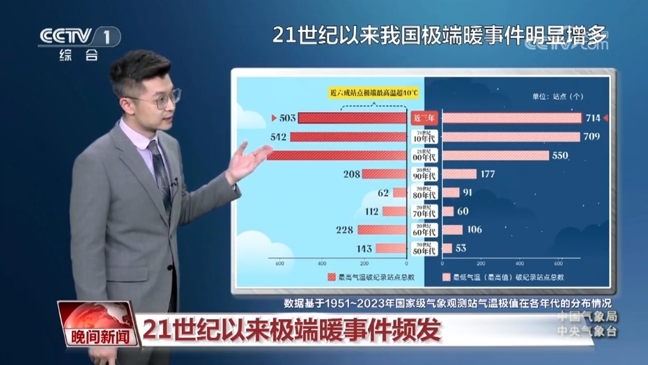 氣象分析師 胡嘯:我們統(tǒng)計了上世紀(jì)50年代以來氣溫創(chuàng)紀(jì)錄的站點,從白天的國家級氣象站創(chuàng)紀(jì)錄站點來看,有百分之七十都出現(xiàn)在21世紀(jì),近三年數(shù)量達(dá)到了503個,在這其中有六成站點的極端最高氣溫都突破了40℃。不僅白天的氣溫高,夜間的氣溫也很高,大致有百分之八十的站點都出現(xiàn)在21世紀(jì)。近三年是達(dá)到了714個,這要比以往任何十年的累加都要多。