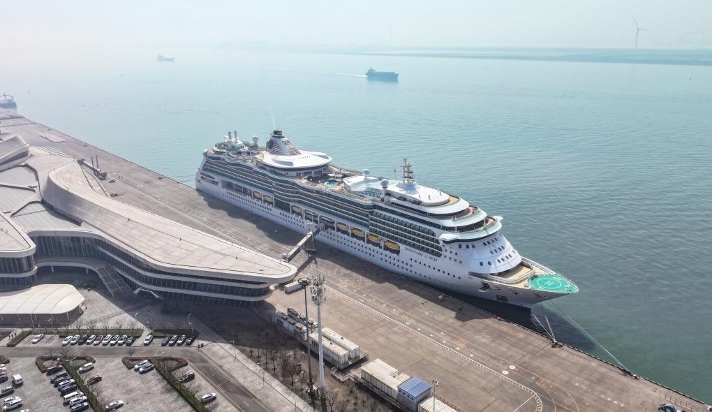 4月7日,“海洋旋律”號(hào)郵輪??吭谔旖驀?guó)際郵輪母港(無(wú)人機(jī)照片)。新華社記者 孫凡越 攝
