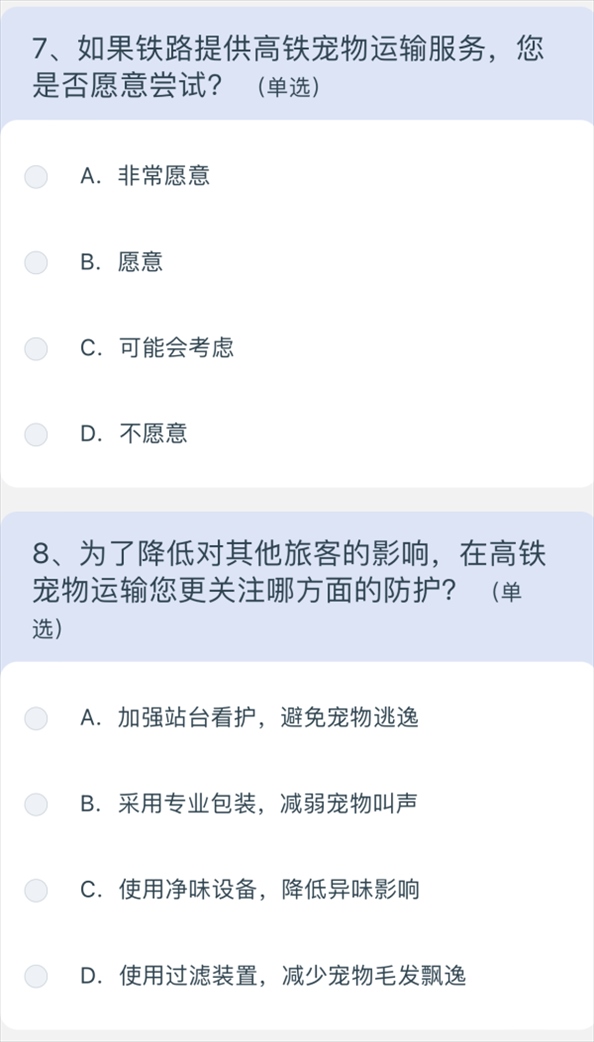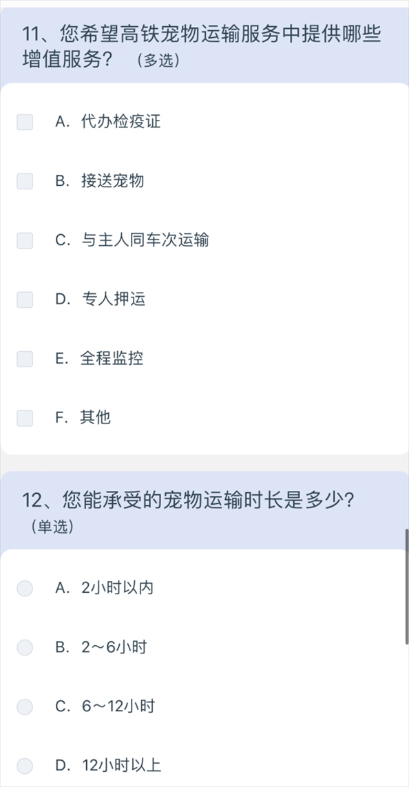 問卷涉及寵物運輸服務(wù)定價、非養(yǎng)寵人士建議等