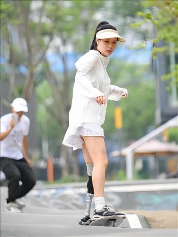 ?下圖為2023年6月20日,胡月在成都市錦江區(qū)輕極限運動公園練習(xí)滑板。(新華社記者 王曦 攝)
