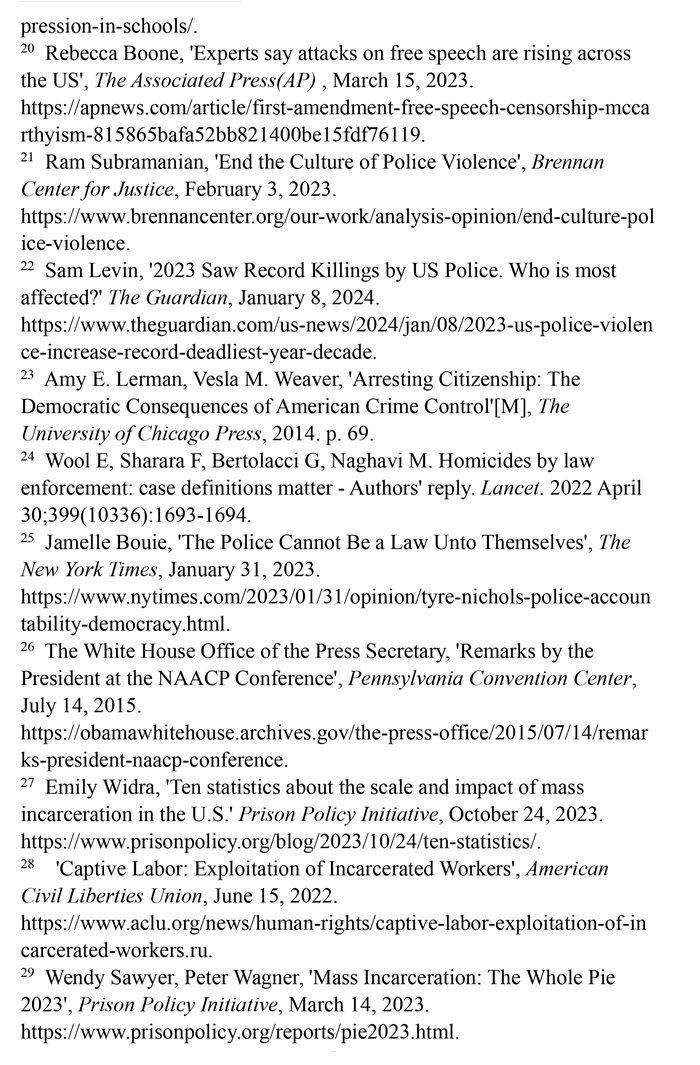 非洲裔在執(zhí)法領(lǐng)域面臨嚴(yán)重種族歧視。2023年1月3日,洛杉磯31歲的非洲裔男子基南·安德森涉嫌交通肇事,警方在制服他的過(guò)程中使用電擊槍擊中其6次,致其心臟病發(fā),送醫(yī)不治身亡。(注39)2023年1月7日,田納西州孟菲斯市的警察以“魯莽駕駛”為由將29歲的非洲裔男子泰爾·尼科爾斯攔下,并對(duì)其進(jìn)行長(zhǎng)達(dá)數(shù)分鐘的殘忍毆打。三天后尼科爾斯因傷勢(shì)過(guò)重去世,而事后的調(diào)查無(wú)法證實(shí)警察關(guān)于其“魯莽駕駛”的說(shuō)法。(注40)這兩起非洲裔遭受警察暴力執(zhí)法身亡案例引發(fā)多名聯(lián)合國(guó)專家的高度關(guān)注。專家們強(qiáng)調(diào),在兩起事件中,警察使用的武力違反保護(hù)生命權(quán),禁止酷刑和其他殘忍、不人道或有辱人格待遇或處罰的國(guó)際準(zhǔn)則,也不符合聯(lián)合國(guó)《執(zhí)法人員行為守則》和《執(zhí)法人員使用武力和火器的基本原則》。(注41)聯(lián)合國(guó)人權(quán)理事會(huì)在執(zhí)法工作中推進(jìn)種族正義和平等的國(guó)際獨(dú)立專家機(jī)制在對(duì)美國(guó)實(shí)地訪問(wèn)后發(fā)布報(bào)告指出,針對(duì)非洲裔的系統(tǒng)性種族主義已經(jīng)滲透到美國(guó)警察隊(duì)伍和刑事司法系統(tǒng)。非洲裔被警察殺害的可能性是白人的3倍,被監(jiān)禁的可能性是白人的4.5倍。在每年1000多起警察殺人案件中,只有1%的涉事警察被指控。報(bào)告警告說(shuō),美國(guó)如果不按照國(guó)際標(biāo)準(zhǔn)改革警察使用武力的規(guī)則,許多殺戮將繼續(xù)發(fā)生。(注42)