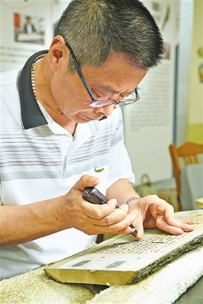文化傳承揚州雕版印刷技藝傳承人進(jìn)行雕版。本報記者 雷 聲攝