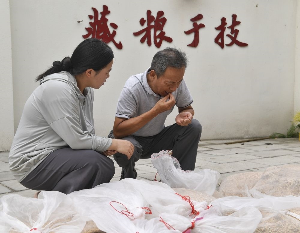2024年9月10日,農(nóng)業(yè)專家、四川農(nóng)業(yè)大學(xué)教授馬均(右)在永豐村水稻科技小院通過(guò)牙咬感受稻谷晾曬程度。