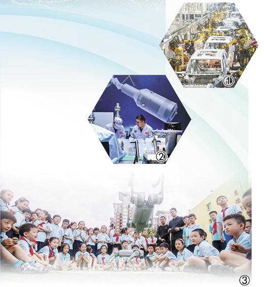 圖①:湖北武漢經(jīng)開區(qū)的嵐圖汽車電動化焊裝車間,機器人正在流水線上作業(yè)。 新華社記者 肖藝九攝 圖②:中國科學院空間光學系統(tǒng)在軌制造與集成重點實驗室的科研人員在進行科研工作。 新華社記者 許 暢攝 圖③:河北邯鄲市復興區(qū)前進小學的學生們在觀看機器狗表演。聶長青攝(人民視覺)