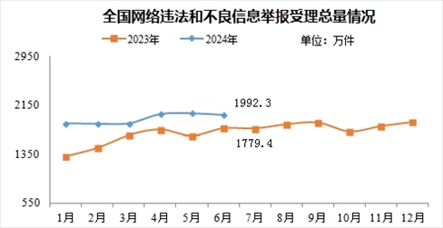 來自中央網(wǎng)信辦舉報中心的消息,2024年6月,中央網(wǎng)信辦舉報中心指導(dǎo)全國各級網(wǎng)信舉報工作部門、主要網(wǎng)站平臺受理網(wǎng)民舉報色情、賭博、侵權(quán)、謠言等違法和不良信息1992.3萬件,環(huán)比下降1.3%、同比增長12%。