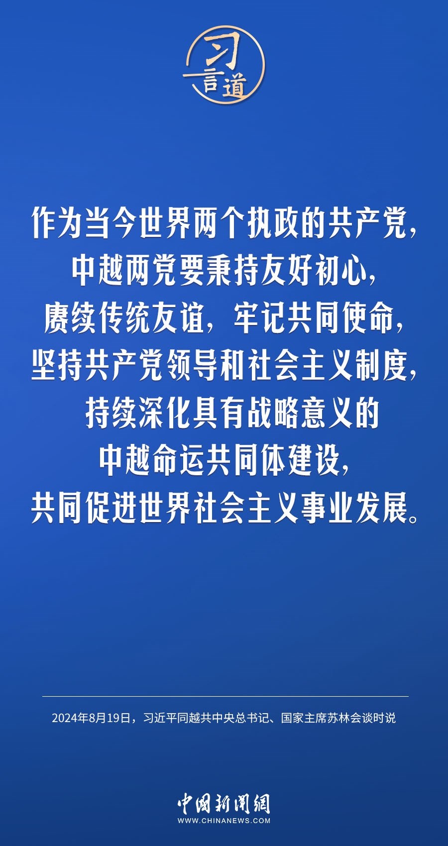 8月19日,中共中央總書記、國(guó)家主席習(xí)近平在北京人民大會(huì)堂同來(lái)華進(jìn)行國(guó)事訪問(wèn)的越共中央總書記、國(guó)家主席蘇林舉行會(huì)談。習(xí)近平指出——