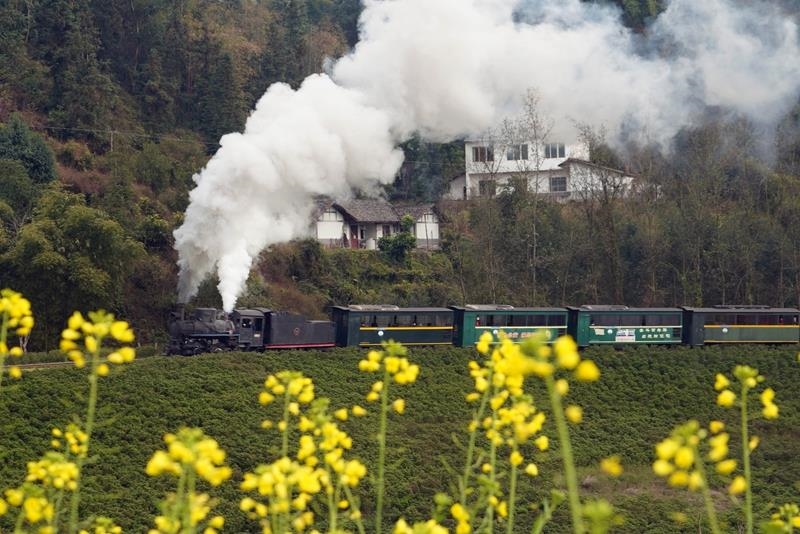 △2025年2月14日,四川樂(lè)山市犍為縣菜子壩景點(diǎn)試種的早季油菜花進(jìn)入盛開(kāi)期,蒸汽小火車(chē)穿越油菜花海,吸引不少游客前來(lái)觀看。