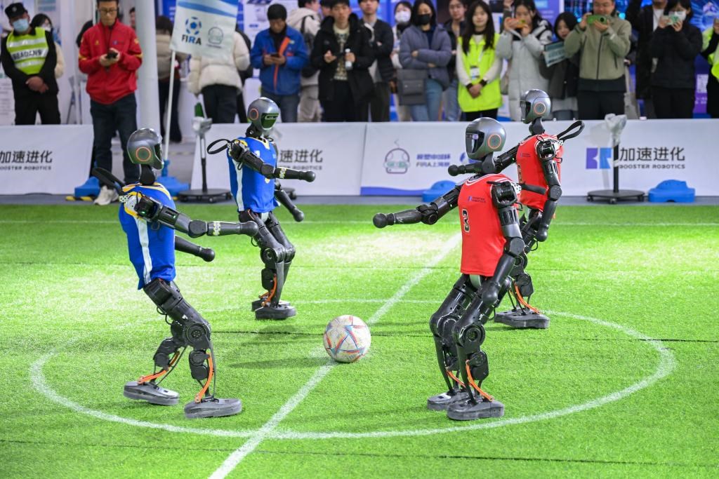 2月21日,機(jī)器人在2025全球開發(fā)者先鋒大會(huì)現(xiàn)場踢足球。 新華社發(fā)(陳浩明 攝)