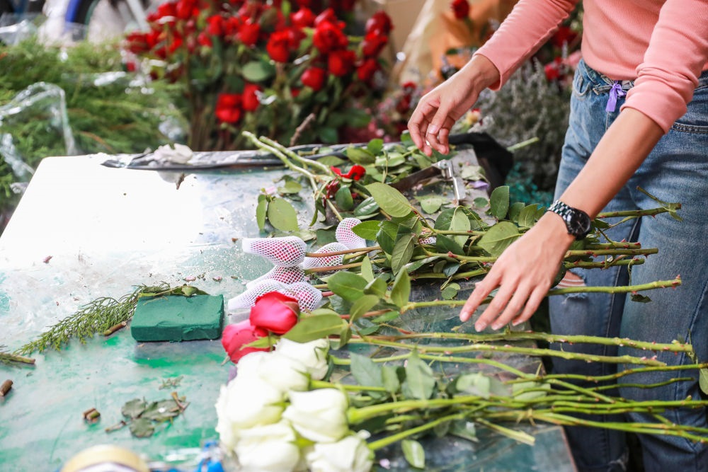 2019年2月14日,在泰國曼谷帕空鮮花市場的一家花店,工作人員將從云南進(jìn)口的鮮花制作成花束和花盒。東南亞是云南花卉的傳統(tǒng)市場,在“一帶一路”倡議推動下,中國與東南亞國家相互開放的產(chǎn)業(yè)合作,為雙方商貿(mào)活動注入新動力。隨著昆曼國際大通道打通,經(jīng)過采摘、分級、修枝、包裝、拍賣等過程,云南鮮花只需近40小時的冷鏈運輸便可抵達(dá)曼谷。