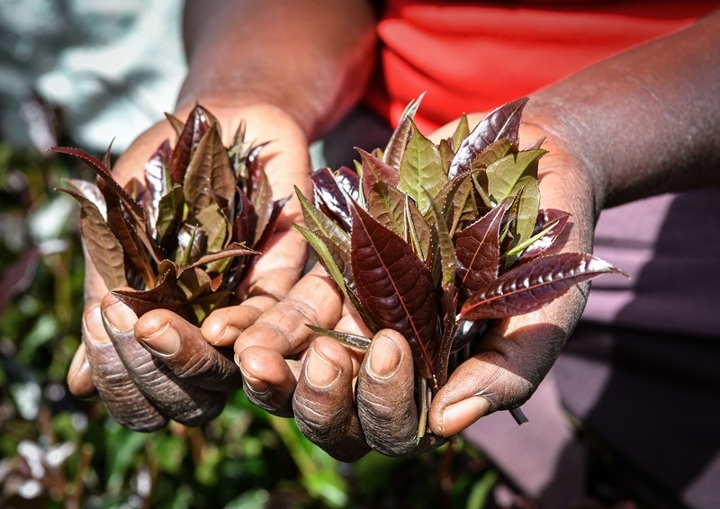 2024年5月6日,在肯尼亞穆拉雅郡的一處紫茶園,茶農(nóng)展示采摘下來(lái)的紫茶。新華社記者 韓旭 攝