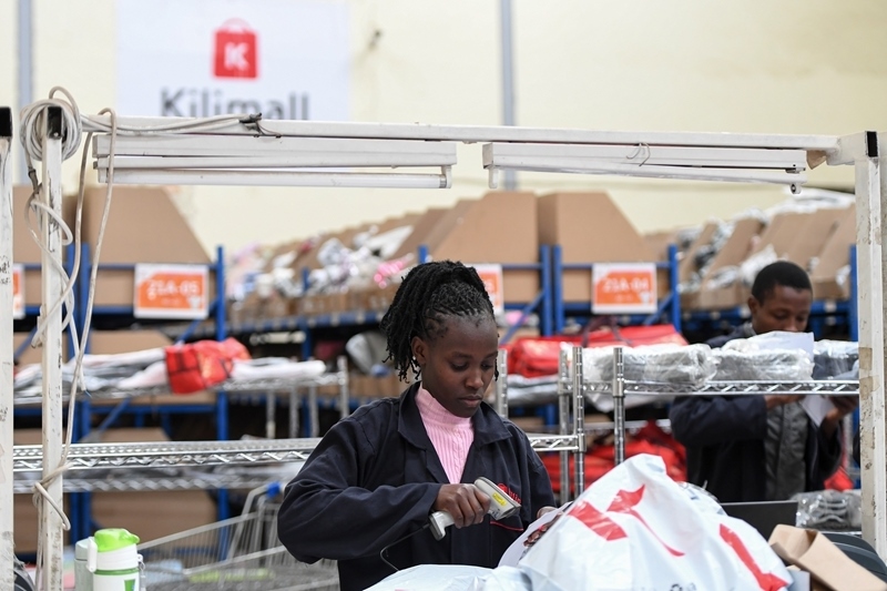 2023年4月20日,在肯尼亞姆洛隆戈,Kilimall員工在倉(cāng)庫(kù)內(nèi)包裝商品出庫(kù)。新華社發(fā)(辜鵬博?攝)