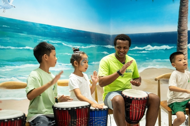 2024年8月30日,在位于湖南高橋大市場(chǎng)的中非經(jīng)貿(mào)博覽會(huì)常設(shè)展館安哥拉館,志愿者(右二)帶領(lǐng)學(xué)生學(xué)習(xí)非洲鼓。新華社記者 陳思汗 攝