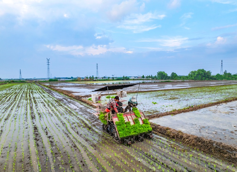6月14日,在江蘇省興化市陳堡鎮(zhèn)蔣莊村,農(nóng)民在田間進(jìn)行插秧作業(yè)(無(wú)人機(jī)照片)。