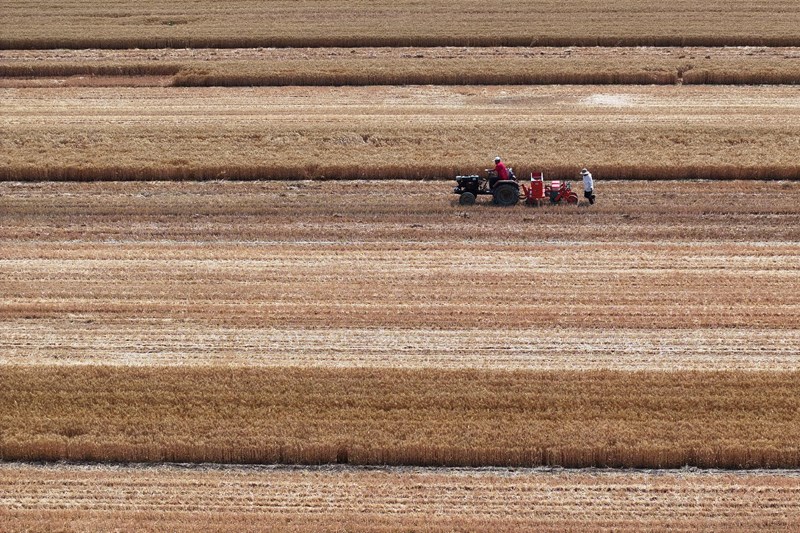 6月10日,在山東省聊城市茌平區(qū)博平鎮(zhèn)任何村,農(nóng)民駕駛農(nóng)機(jī)播種玉米(無(wú)人機(jī)照片)。