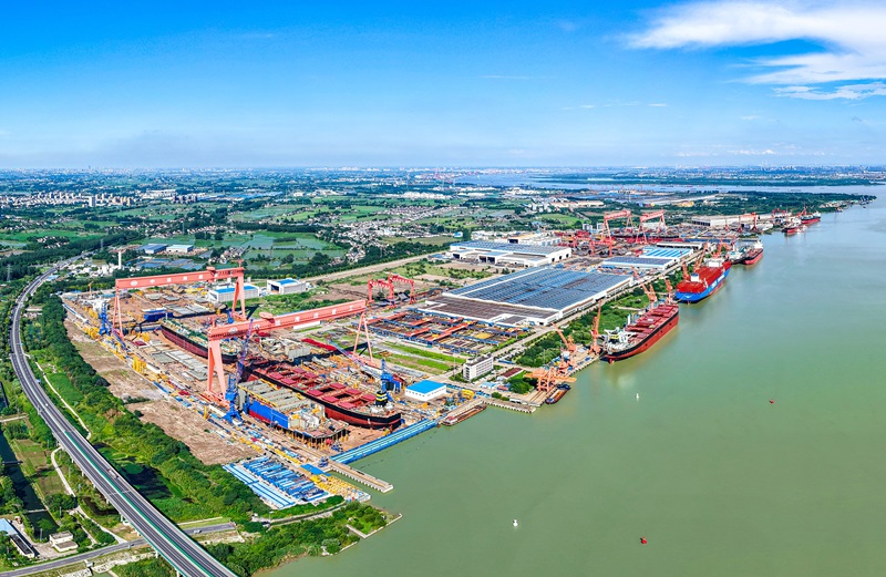 6月28日拍攝的位于江蘇省江都經(jīng)濟(jì)開(kāi)發(fā)區(qū)的揚(yáng)州中遠(yuǎn)海運(yùn)重工有限公司生產(chǎn)廠區(qū)(無(wú)人機(jī)照片)。