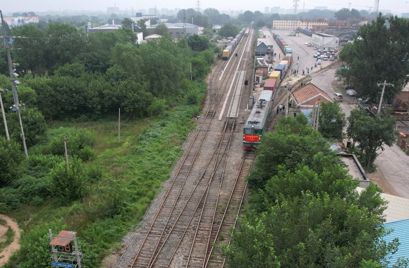 6月30日,北京至阿塞拜疆巴庫的跨里海中歐班列??吭谖挥诒本┦蟹可絽^(qū)的北京國際陸港等待發(fā)車(無人機照片)。