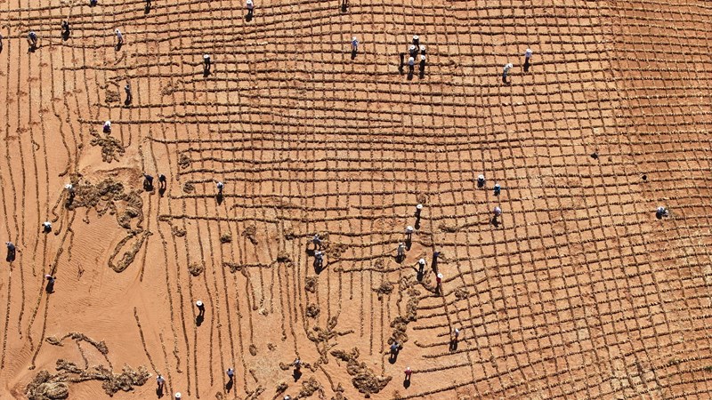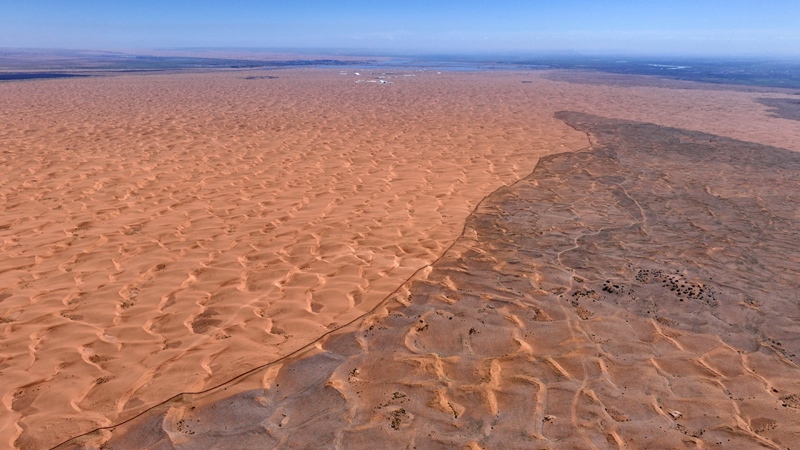 6月30日,在位于寧夏中衛(wèi)市長流水村的騰格里沙漠東南緣,隨著治沙工人將最后一列草方格穩(wěn)穩(wěn)扎下,這項跨越半個世紀的治沙工程,在騰格里沙漠寧夏境內實現(xiàn)全面“鎖定”。一條長153公里、最寬處達38公里的固沙鎖邊帶蜿蜒開來。