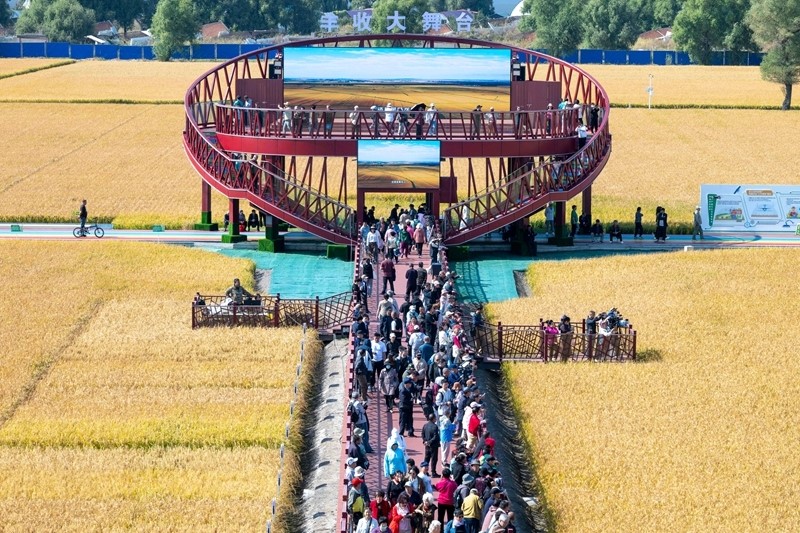 9月23日,2025年中國農(nóng)民豐收節(jié)黑龍江省主場活動在北大荒農(nóng)墾集團閆家崗農(nóng)場稻田藝術(shù)公園拉開帷幕,人們歡聚一堂,共享一場同耕耘、共歡歌的豐收盛宴。