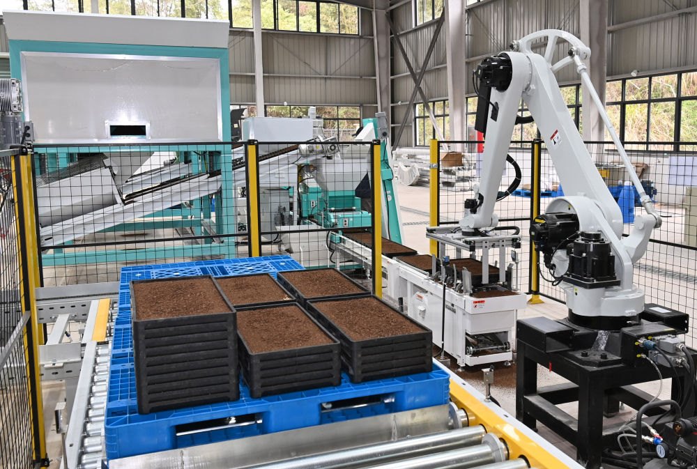 在浙江省東陽市皇野生態(tài)農業(yè)有限公司現(xiàn)代農事服務中心,全自動智能水稻育秧生產線在制作秧盤(2025年3月13日攝)。新華社發(fā)(包康軒 攝)