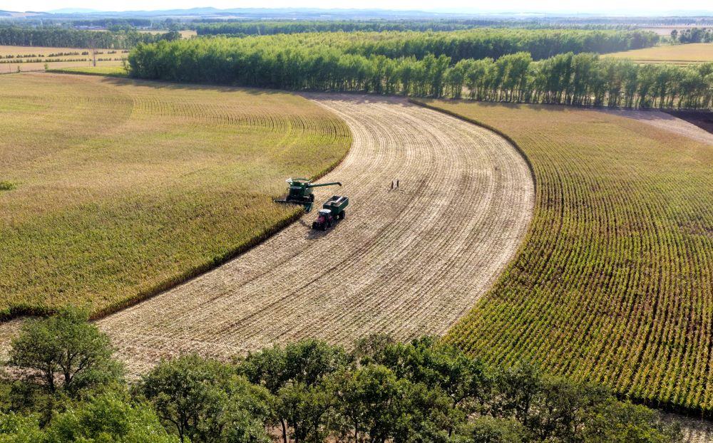 秋高云淡,黑龍江省七臺河市勃利縣的玉米地里一派繁忙景象。大型收割機往來穿梭,飽滿的玉米棒被自動精準收入機身。脫粒后,金燦燦的玉米粒源源不斷涌入隨行的運糧車。