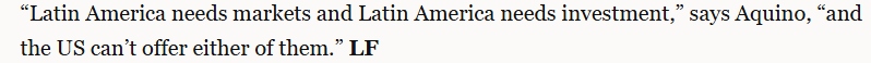 文章指出,并非所有人都對(duì)拉美與中國之間的合作感到滿意。華盛頓尤其擔(dān)心。不過,許多人認(rèn)為華盛頓影響拉丁美洲的能力有限。文章援引利馬國立圣馬科斯大學(xué)的亞洲經(jīng)濟(jì)專家卡洛斯·阿基諾的話指出,“拉丁美洲需要市場和投資,但美國無法提供其中任何一項(xiàng)”。